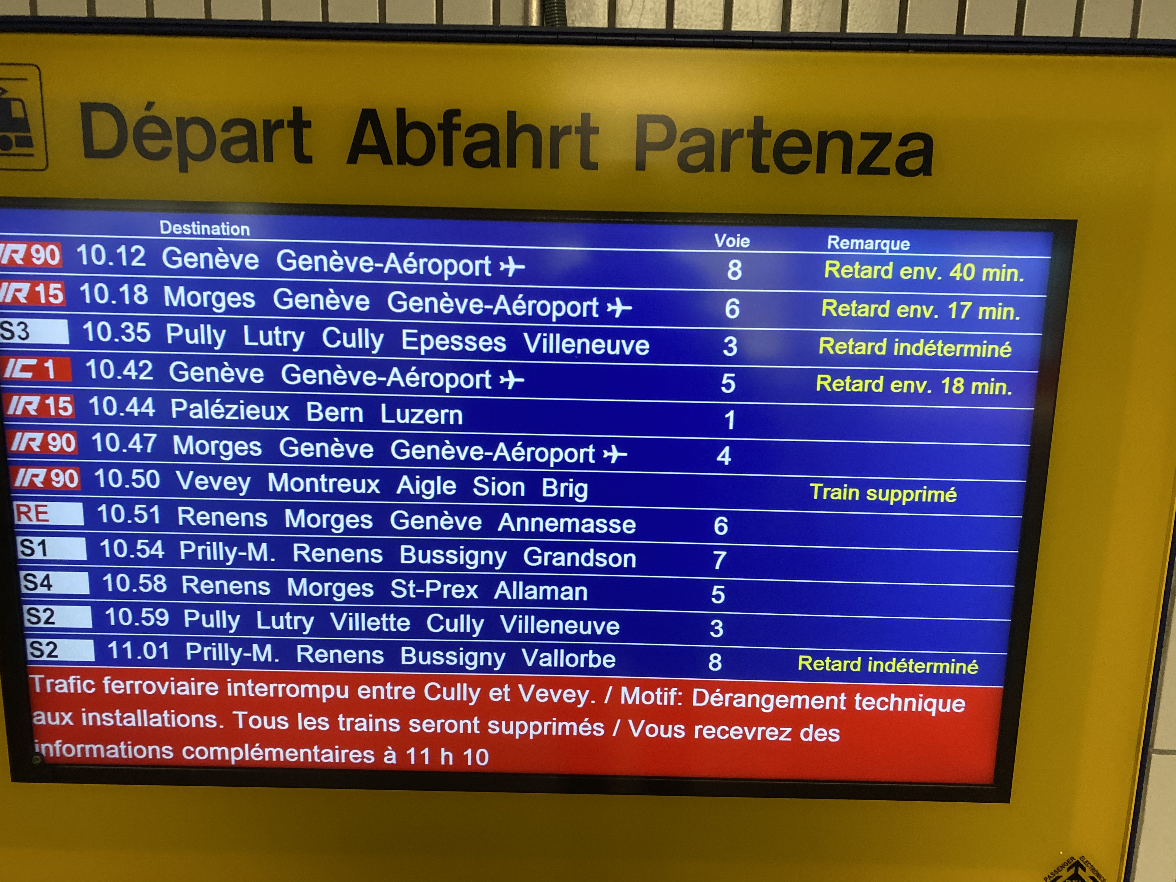 la ligne IR90 en direction de Brig via Sion et Martigny est à l’arrêt total depuis 10h21 au départ de Lausanne. Les RE pour St-Maurice ne sont quant à eux toujours pas opérationnels.