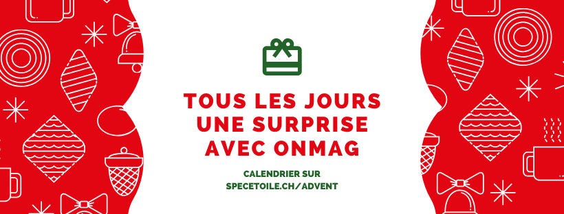 La période de l’avent rime avec surprises et cadeaux chez Onmag, c’est pourquoi notre maison mère SpecEtoile à décidé d’ouvrir un tout grand calendrier de l’avent. Pour y participer et tenter de remporter de grands lots, il vous suffit de vous connecter tous les jours sur https://specetoile.ch/advent ! Nous vous souhaitons bonne chance !