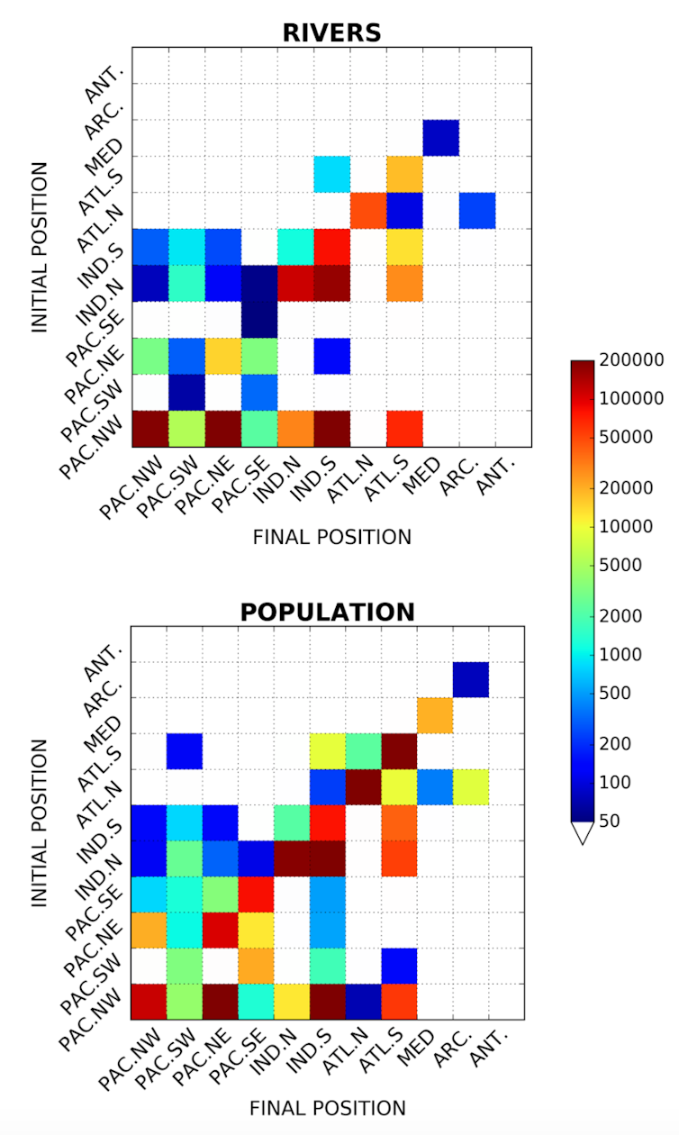 Dans le scénario des rivières, 70 % des particules se sont échouées, contre 54 % dans le scénario population. Malgré cette différence en nombre et une répartition des sources distincte, leur répartition finale est semblable dans les deux cas : les particules s’échouent, dans les deux cas, sur presque toutes les côtes. Cette homogénéité s’explique peut-être par le fait qu’elles suivent les mêmes courants. Cette redistribution entre les sources et les puits révèle qu’il existe potentiellement des connexions particulières entre certaines régions côtières.