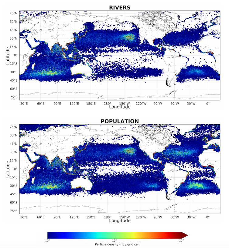 Pour mimer l’apport continuel de la pollution plastique dans l’océan, 20 000 particules sont relâchées chaque mois dans les deux scénarios – soit un total d’environ 6 millions de particules sur les 23 années de simulation numérique. Bien que dans la réalité les apports par les rivières et les ceux par la population côtière représentent des niveaux de contamination différents, nous avons choisi de modéliser le même nombre de particules dans chaque scénario afin de pouvoir comparer leur trajet.