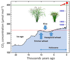 En réduisant le nombre potentiel de tiges ou en raccourcissant leur taille, pour privilégier la production de grain au détriment de la biomasse végétative, la sélection variétale a durant la révolution verte considérablement réduit les capacités de stockage de carbone des variétés améliorées, et par là, leur faculté à répondre positivement au eCO2.